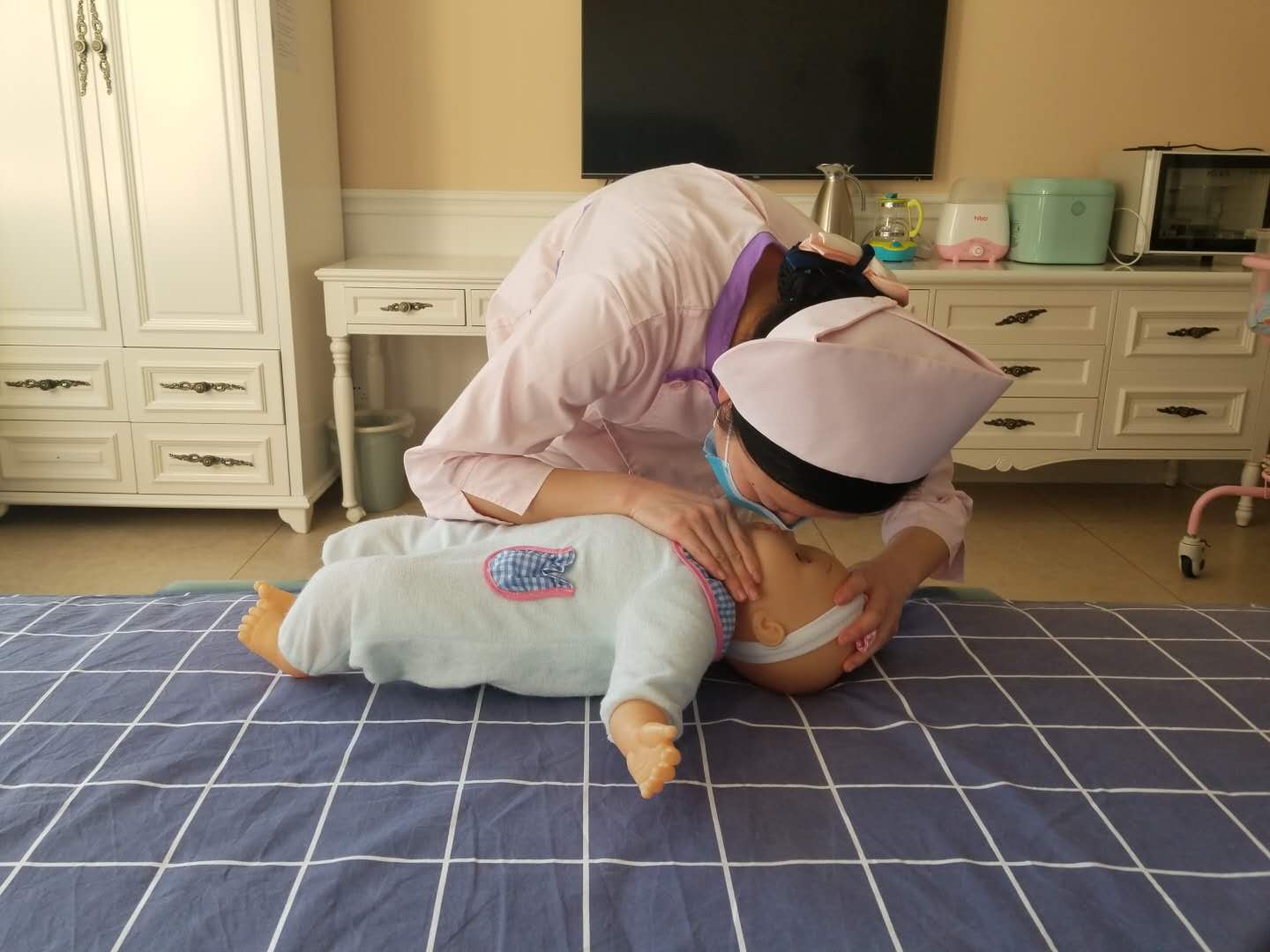 操作方法:立即將患兒取頭低腳高位,俯臥在施救者腿上,讓嬰兒上身前傾45~60度,施救者左手虎口打開、托住嬰兒下頜、打開氣道,用右手掌跟大魚際部位用力扣拍嬰兒背部4—5次,具體位置為背部肩胛骨中間,通過振動(dòng)使吸入呼吸道的奶汁或痰液排出。
